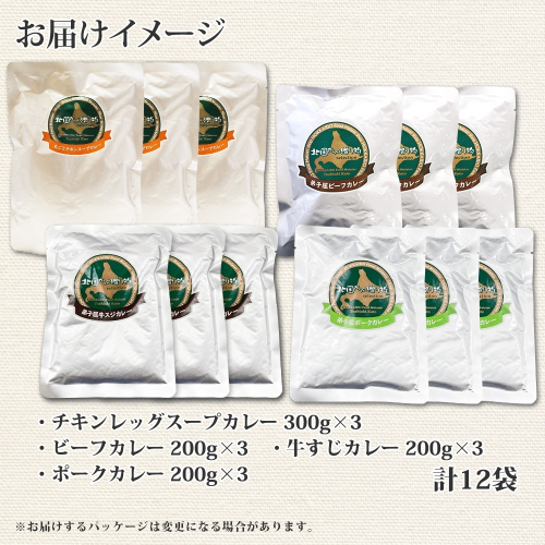 - 782.カレー 4種 食べ比べ 計12個 中辛 スープカレー ビーフカレー ポークカレー 牛すじカレー じゃがいも 牛 牛肉 豚肉 肉 鳥 鶏 業務用 レトルトカレー 保存食 備蓄 まとめ買い 送料無料 北海道 弟子屈町