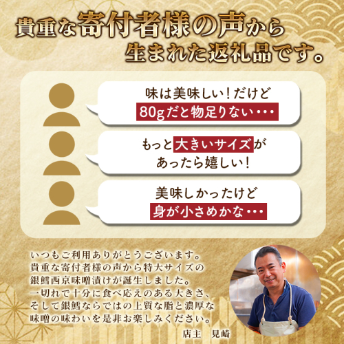 【説明】脂のりの良い銀だらに、こだわりの特製味噌を漬け込みました。柔らかい身と味噌のコクがご飯のお供やお酒のあてにぴったりです。寄付者様からいただいた御感想を元に、通常よりも大きい110gサイズが新しく返礼品に加わり、一切れで大満足のボリューム感ある西京味噌漬けに仕上がりました。是非自慢の銀だらを贅沢にお楽しみください。