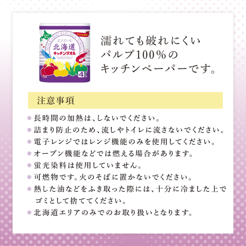 北海道の特産品をパッケージにデザインしたキッチンタオル。水も油もしっかり吸収し、濡れても破れにくいパルプ100%のキッチンペーパーです。また、電子レンジも使用可能です。