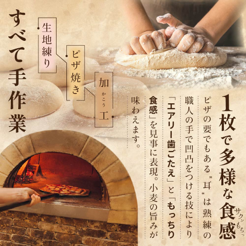 機械では出来ないピザの十要素でもある耳を人の手で凹凸をつけ、軽い食感の部分もあればモチっとした食感をつける等一枚で色々な食感、小麦の旨みが味わえます!