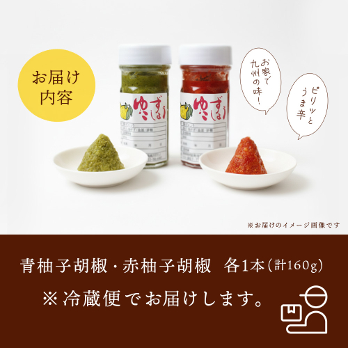 摘果の柚子、青い唐辛子で作った緑色と、赤く熟した唐辛子で作った赤い色の2本セットでお届けします。青柚子胡椒は、若い柚子の爽やかな香りと、ピリッとした辛さが特徴です。赤柚子胡椒は、香りが強く味に深みと辛さを添え、鮮やかな見た目が食欲をそそります。鍋料理、うどん、ドレッシングなどお好みでいろいろなお料理にお使い下さい。