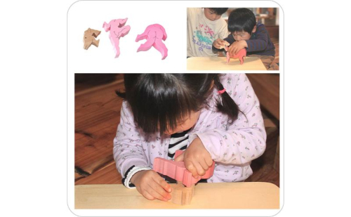 ロバがセクシーな女性で出来ている木製の知育パズルが入っています。おもちゃの材質はブナ材 日本製 psc