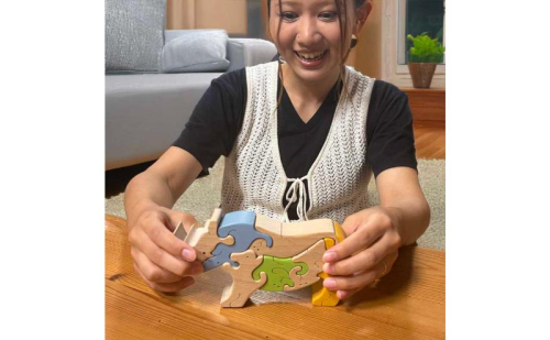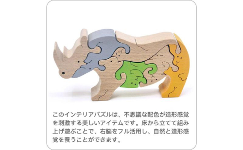 - サイがカラフルな動物たちで出来ている木製の知育パズルが入っています。おもちゃの材質はブナ材 日本製 psc