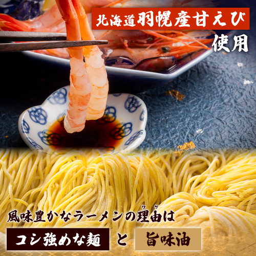 北海道羽幌産の新鮮な甘えびを贅沢に使用した、風味豊かな塩ラーメンと味噌ラーメンのセットです。