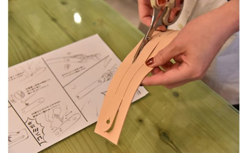 今回は、アウトドアに使えるレザーアイテムを自宅で製作できるよう開発しました。良質なオイルを含んだ近江牛レザーを使って製作します。革を切り出し、コバ磨き、組み立てていくだけで、お洒落で高級感のある革小物が完成します。ネジで止めるという方法を使っているので、自宅で特別な工具もなく制作できます。同封されている説明書を読んでいただき、プラモデルを作るように進めていただければと思います。