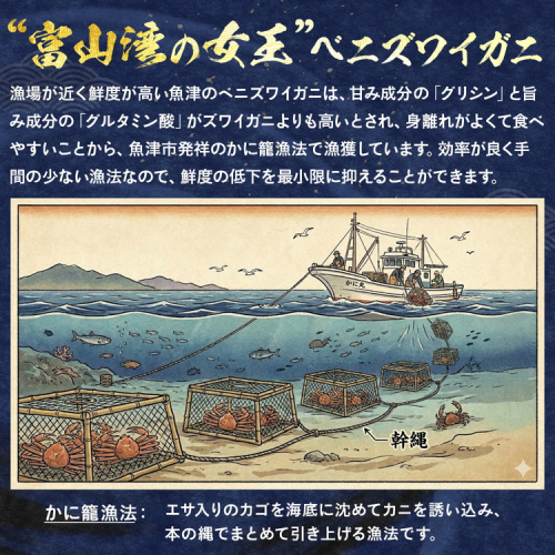 ベニズワイガニは、魚津市発祥のかにかご縄漁法で漁獲されています。この漁法は効率が良く、それまで行われていた刺網漁法に比べて手間が省ける為、鮮度の低下を最小限にすることが出来ます。最近では網目を大きくするなどして、小さなカニは網から出られるように工夫されています。また、禁漁期間が設けられるほか、雌ガニの漁獲を禁止するなど資源の保護も行われています。