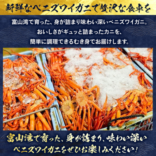 全国でも有数の紅ズワイガニの産地である富山県魚津市。港から5分の距離にある「魚卸問屋 はりたや」では、早朝の競りで直接買い付けしたベニズワイガニを、新鮮なうちに釜茹でしております。本商品は、ホクホクのベニズワイガニを、この道数十年の熟練職人が1本1本手剥きしたカニ身で、カニ飯、ちらし寿司、サラダ、おつまみ等に最適です。「カニは好きだけど剥くのはちょっと・・・」という方にもオススメです。