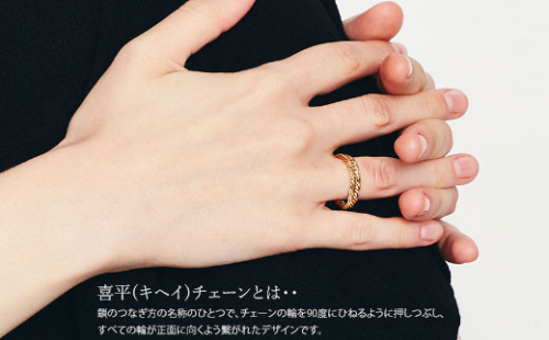 トリプル12面喜平は、カット数が多く、目が詰まっており、手元で美しく輝く喜平リングです。性別を問わず、どんなシーンでも着けていただけます。リングの作りとして、3コマずつ編み込む事で、金が充溢しており、重厚感があります。