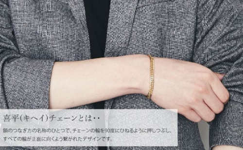 細い幅の喜平は着け心地も軽く、女性でもお楽しみいただけるチェーンです。