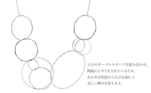大小のサークルモチーフを組み合わせたデザインのロングネックレスです。