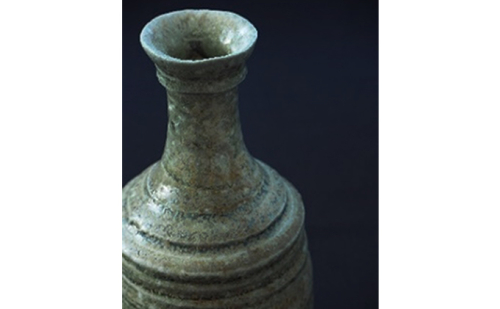 この作品は須恵器の焼成方法を用いて、寒風作家協議会登録作家・末廣学氏によって制作された「寒風須恵器 徳利」です。首が長めの端正なフォルムの徳利です。 瀬戸内市は古墳時代から平安時代にかけて中四国地方最大の須恵器生産地でした。この須恵器が現在の備前焼に発展していったといわれています。特に、瀬戸内市牛窓町長浜にある寒風古窯跡群(国の指定史跡)で焼かれたやきものの一部は、奈良の都へ送られ、税として納められていました。寒風の須恵器は色が白く、都で珍重されたといわれています。 地元の郷土史家である時實黙水氏により寒風の発掘調査が進められ、1993年、同氏が97歳で亡くなるまでの60年間で、1万点以上の須恵器を集めました。発掘調査の成果は県内で発行された考古学の機関紙「吉備考古」に発表したり、資料図録「オクノカマアト」の自費出版なども行い、寒風古窯跡群の重要性が知られるようになりました。