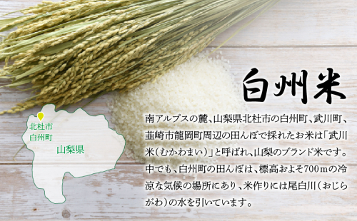 さらに、農家の方々の研究、努力も加わり育った「白州米コシヒカリ」は、新潟産コシヒカリとも肩を並べる、とても美味しい自慢のお米です。