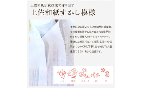 土佐和紙伝統工法を用いた、すかし模様のトイレットロールです。 シングル(55m巻)で、しっかり丈夫でハリのある紙質が特徴です。お客さまからはこの紙質が使い勝手がいい!と根強い人気のある商品です。 白地に3色のすかし模様(白・ピンク・ブルー)の入ったトイレットロールを、それぞれ20ロールずつお楽しみいただけます。 ※大変お申込みの多い返礼品のため、納品に3ヶ月ほどかかる場合がございます。 柄 花柄 すかし模様 まとめ買い トイレペーパー おしゃれ かわいい 贈答 日用品