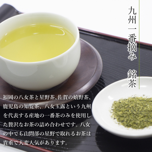 福岡の八女茶と星野茶、佐賀の嬉野茶、鹿児島の知覧茶、八女玉露という九州を代表する産地の詰め合わせです。