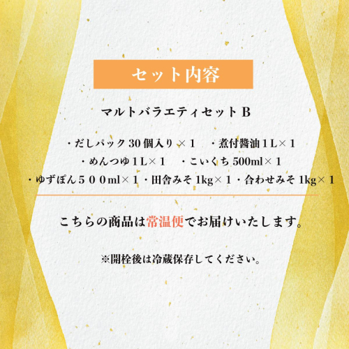 - 調味料 詰め合わせ マルト バラエティ セット B [マルト醤油醸造元 福岡県 宇美町 um40azo720002] だしパック 出汁パック 煮付醤油 めんつゆ こいくち 濃口 ゆずぽん 味噌 みそ ミソ 田舎みそ 合わせみそ