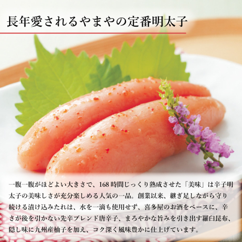 一腹一腹がほどよい大きさで、168時間じっくり熟成させた「美味」は辛子明太子の美味しさが充分楽しめる人気の一品。