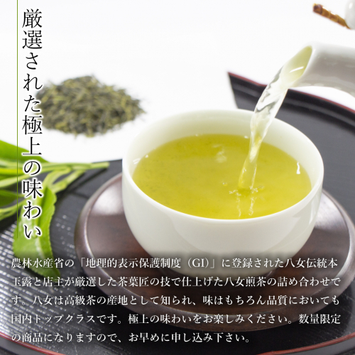 農林水産省の「地理的表示保護制度(GI)」に登録された八女伝統本玉露と店主が厳選した茶葉匠の技で仕上げた八女煎茶の詰め合わせです。