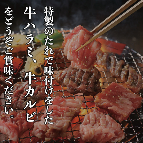焼肉の定番、牛ハラミと牛カルビを自社特製のたれで味付けました。