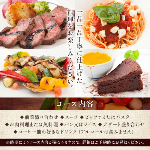 (コース内容)前菜盛り合わせ、スープ、ピッツァまたはパスタ、お肉料理または魚料理、パン又はライス、デザート盛り合わせ、コーヒー他お好きなドリンク(アルコールは含みません)