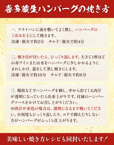 ・喜多蔵ハンバーグ:牛肉(豪州産)、玉ねぎ、牛脂(国産)、パン粉、卵、牛乳、赤ワイン、食塩、ニンニク、植物油脂、香辛料/調味料(アミノ酸)、(一部に牛肉・卵・乳成分・小麦・大豆・ゼラチンを含む)