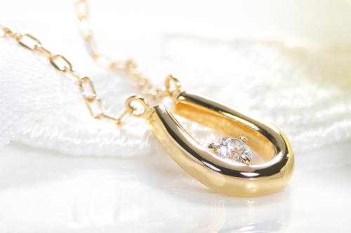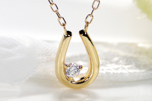 大人気のホースシュー(馬蹄)モチーフに、一粒のダイヤモンドをあしらえたネックレスです。