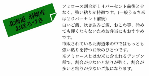 「おぼろづき」はアミロース割合が14パーセント前後と少なく、強い粘りが特徴です。(一般うるち米は20パーセント前後)