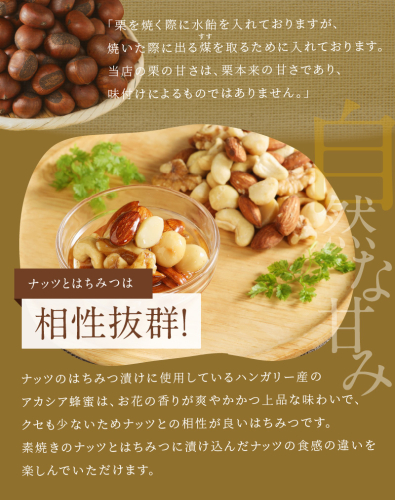 当店人気の天津甘栗を700g(350g×2袋)と健康食品の王様『はちみつ』に当店自慢の栄養豊富な『ミックスナッツ』をつけ込んだ、【ナッツのはちみつ漬け】と【素焼きのミックスナッツ】をお届けします。