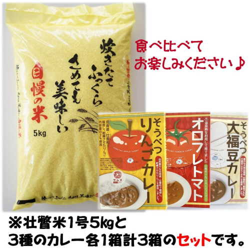- 壮瞥1号米5kg、そうべつ大福豆カレー・そうべつりんごカレー・オロフレトマトカレー 各180g(1食分)×1箱