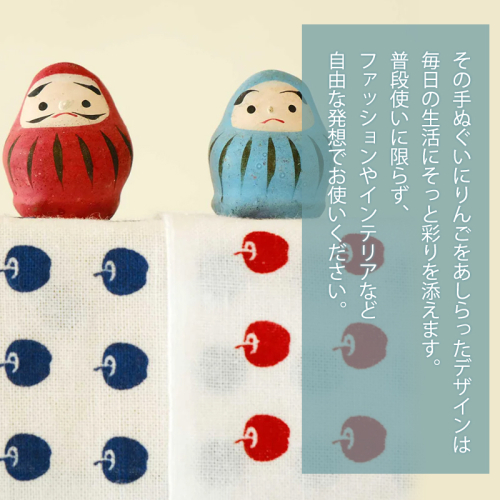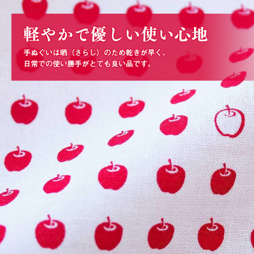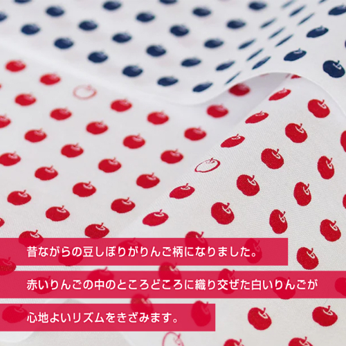 昔ながらの豆しぼりがりんご柄になりました。 赤いりんごの中のところどころに織り交ぜた白いりんごが心地よいリズムをきざみます。