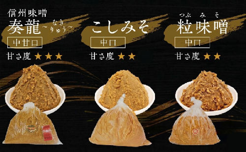 創業文政四年(1821年)以来、現在に至るまで昔ながらの製法を貫く七代目のご主人が仕込んだ、上田市特産信州味噌3種の詰合せ。