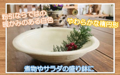 サラダや煮物などの盛り鉢としてはもちろんのこと、一人用のカレーやシチューを盛り付けてもたっぷりなサイズ感! 和洋問わず使える白と、やわらかなだ円が食卓をお洒落に見せます。 【粉引(こひき)】 ベースの粘土の上に、白化粧という白い泥をかけ、釉薬(陶磁器の表面を覆うガラス質の膜)をかけて焼いた器 [陶器のお取り扱いについて] ・陶器には吸水性がありますので、醤油などの調味料や油分を吸収しやすくなります。ご利用前に水にくぐらせてお使いください。調味料のシミなどができづらくなります。 ・長時間食品を入れたままにしないでください。電子レンジの使用は可能です。 ・ご利用後は食器洗浄機の利用は控えていただき、よく乾燥して保管ください。