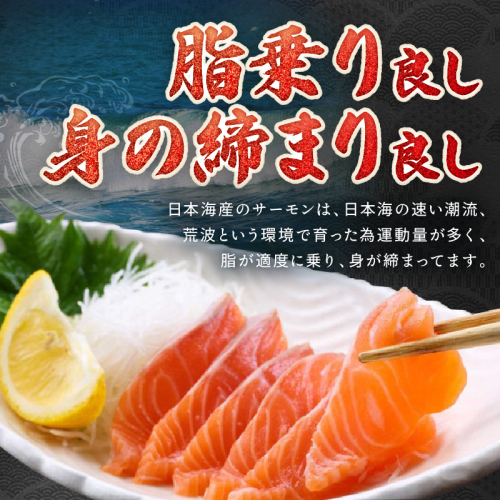 日本海産のサーモン(鮭(さけ))は、日本海の速い潮流、荒波という環境で育った為運動量が多く、脂が適度に乗り、身が締まっています。水揚げ後に直ちに1尾ずつ活〆され血抜きをしてあるので生臭さが少なく歯ごたえがあり、身は柔らかく刺身やカルパッチョで食べて頂くのがおススメです!