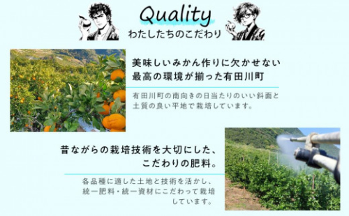 生産地として古い歴史を持ち日照時間が長く、傾斜地が多い地形で排水性に優れていることから良質産地である有田みかん。
