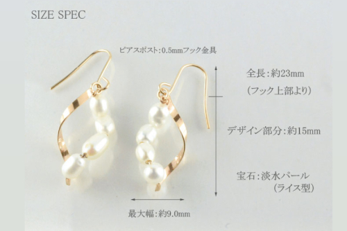 ゴールドの優しい輝きとライス型のパールが相まって、繊細で華奢なデザインに華やかさと可憐さがプラス。