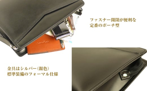 【フォマール仕様のメンズセカンドポーチ】 小脇に抱えて便利な本革製クラッチバックとして、ファスナー開閉が便利な定番のポーチ型本革製セカンドバックとして、そして、金具はシルバー(銀色)標準装備のフォーマル仕様です。