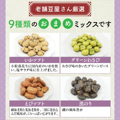 海老、醤油、海苔など、とりどりの小粒豆菓子におかき、グリンピースなどをミックスした「次はどの味にしようかな」とついつい手がでる一品となっています。