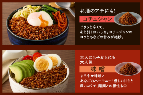 島根県産の煮穴子をメイン材料として、その中に粒状大豆たんぱくを混ぜ、生ふりかけ風のあなごそぼろを作りました。鉄板はご飯のお供。万人受けする商品です。
