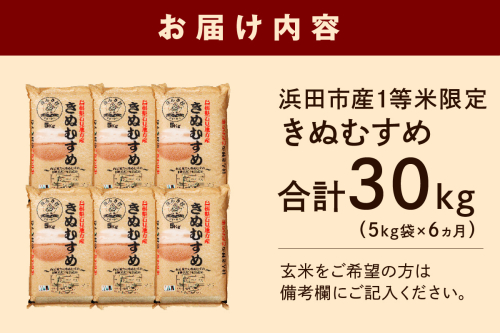 【令和7年産】【新米先行予約】浜田市産きぬむすめ30kg(5kg×6回コース)【定期便】きぬむすめ 定期便 お米 お取り寄せ 特産 精米 白米 ごはん ご飯 コメ 新米 玄米 一等米 30kg 30キロ 応援 準備 【197_1956】