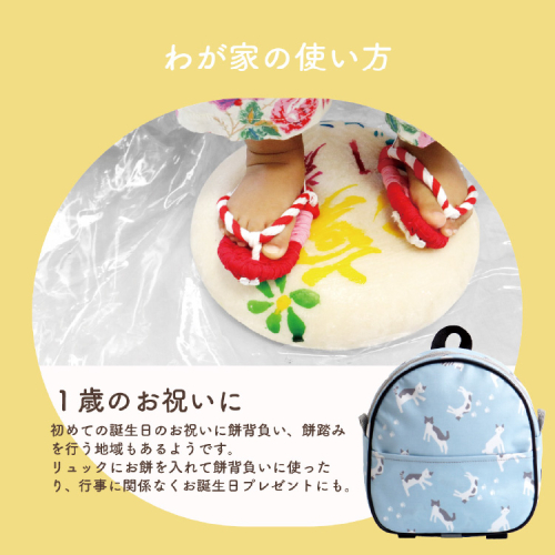 ポーチェの『ベビーリュック』は、普段のお出かけはもちろん、餅踏みの際に一升餅を入れて背負えるリュックです。