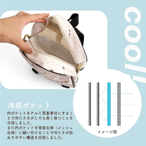 保冷剤ポケット付き&背面メッシュ素材で暑い日のお出かけも安心。