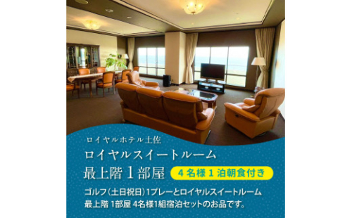 高知県でも有数の名門ゴルフ場 Kochi 黒潮カントリークラブ「土日祝日1プレー」と、Royal Hotel 土佐の1泊朝食付きの宿泊プラン4名様分がセットになった商品です。