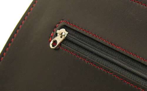 - 大きめサイズでブラックレッド配色の本革メンズポーチ「ビッグポーチ (黒革・赤ステッチ)」