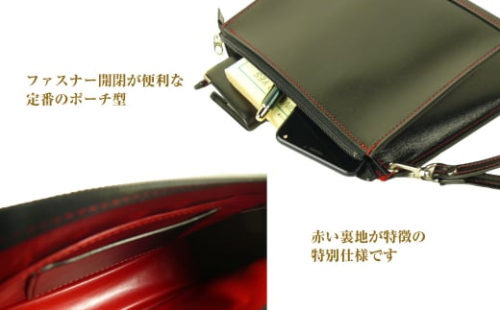 - ベーシックなブラックレッド配色の牛本革セカンドポーチ「メンズポーチ (黒革・赤ステッチ)」
