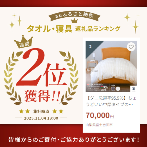 1. ダウンケットよりも厚く本掛けよりも薄い、中厚の羽毛布団です。
