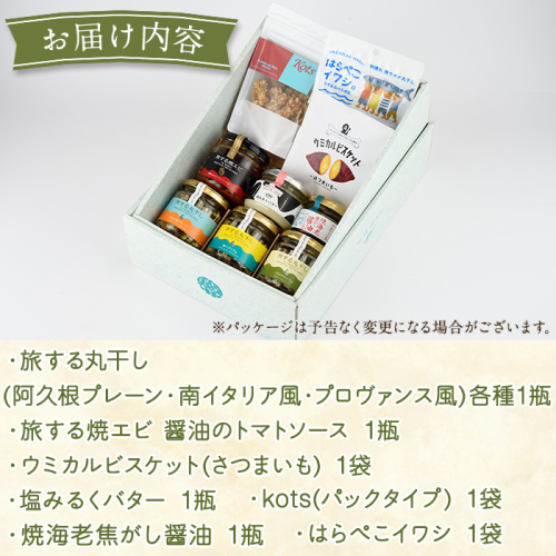 セット内容:旅する丸干し 阿久根プレーン×1瓶、旅する丸干し 南イタリア風×1瓶、旅する丸干しプロヴァンス風×1瓶、旅する焼エビ 醤油のトマトソース×1瓶、塩みるくバター×1瓶、焼海老焦がし醤油×1瓶、ウミカルビスケット さつまいも×1袋、kots×1袋、はらぺこイワシ×1袋