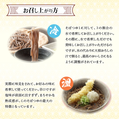 繊細な日本蕎麦の風味を邪魔することなく、さらに引き立てるこだわりの辛口つゆです。