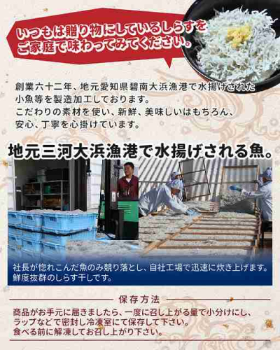 地元碧南市にある大浜漁港で水揚げされる、太平洋白砂の地域でとれた色が白く、細かい上級品のしらすをふっくら柔らかく干しあげた贈答用のしらす干しです。