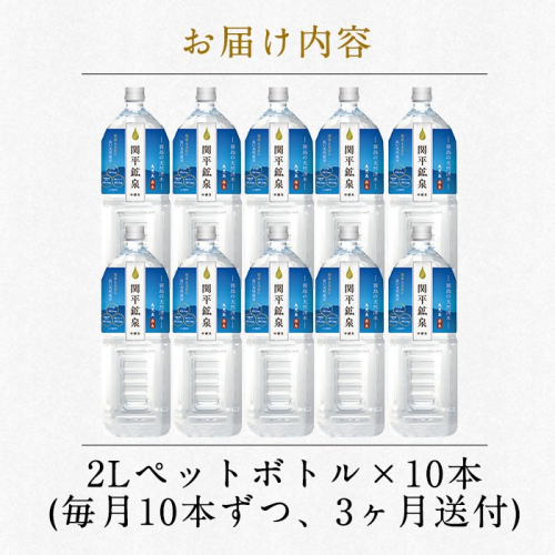 K-187 <定期便・全3回>関平鉱泉水2Lペットボトル×10本ずつお届け(計30本)【関平鉱泉所】霧島市 水 2l ミネラルウォーター 温泉水 シリカ シリカ水 ミネラル成分 飲料水 2リットル 水2リットル 定期便