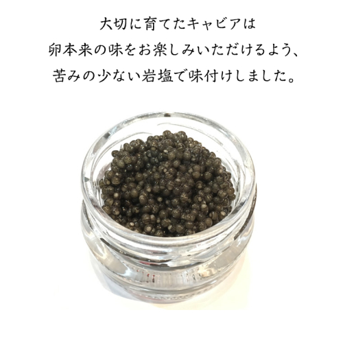 茨城の名峰筑波山の伏流水で養殖したチョウザメから誕生した国産キャビア。岩塩のみで調味し熟成させたキャビアは、口当たりがまろやかで素材の味が感じられる逸品です。急速冷凍で鮮度と旨味を閉じ込め、食べる直前まで美味しさを保っています。料理に添えるだけで華やぎ、一粒一粒が優しいアクセントを与え奥深い味わいが広がります。 茨城県に特産物を作りたいという想いから、筑波山の麓の美しい田園が広がる故郷・桜川市でチョウザメの養殖を開始してから早いもので10年以上の月日が経ち、チョウザメの飼育数も6,000匹以上を数えることができました。応援してくれる方も増え、有難いことに認知度も向上して来ました。現在では、桜川市が選ぶ市内の特産品「さくら川百貨」に選出されたチョウザメの卵であるキャビアだけでなく、魚肉も茨城県内の飲食店やホテルなどに出荷して皆様に楽しんでいただいています。 【賞味期限】 冷凍:商品到着から30日間 解凍後はお早めにお召し上がりください。 【注意事項】 解凍後はお早めにお召し上がりください。 ※配送できない地域がございます※ ・伊豆諸島:青ヶ島村(青ヶ島)・利島村(利島)・御蔵島村(御蔵島)・式根島 ・小笠原諸島:小笠原村(父島・母島・硫黄島・南鳥島など)