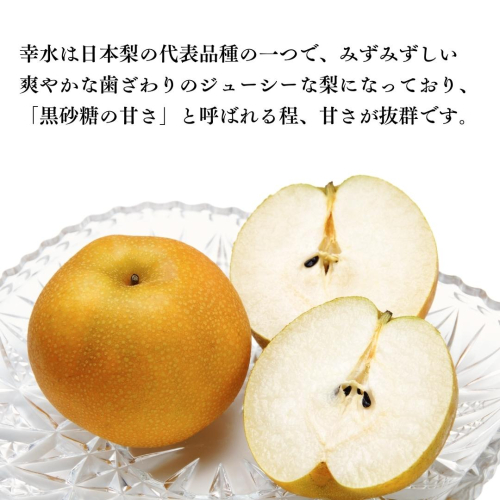 幸水は日本梨の代表品種の一つで、みずみずしい爽やかな歯ざわりのジューシーな梨になっており、「黒砂糖の甘さ」と呼ばれる程、甘さが抜群です。